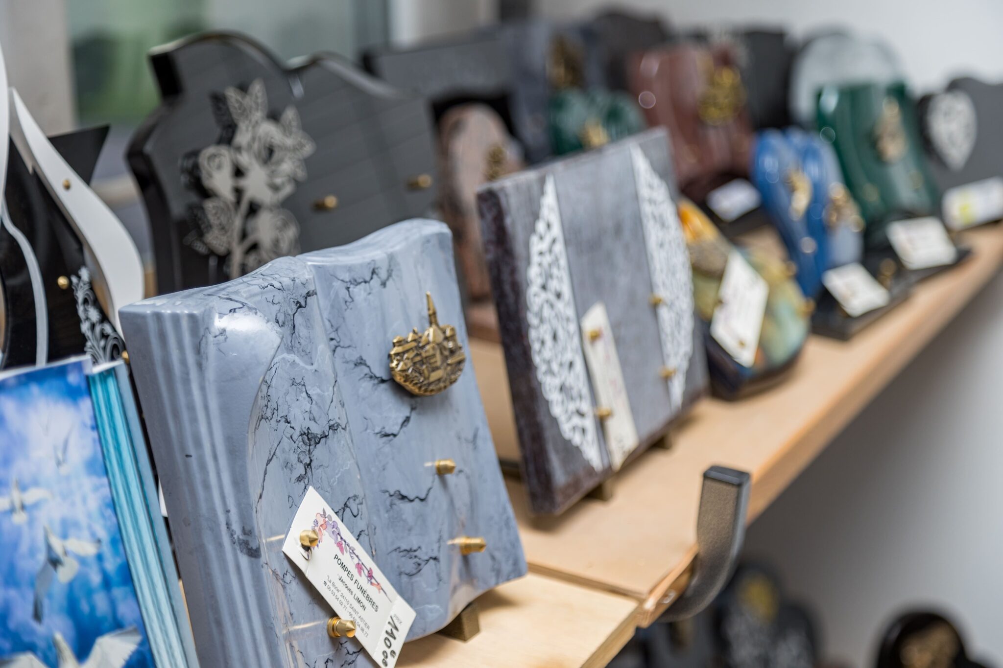 - – les articles : cercueil, capiton, urne, fleurs, plaques;